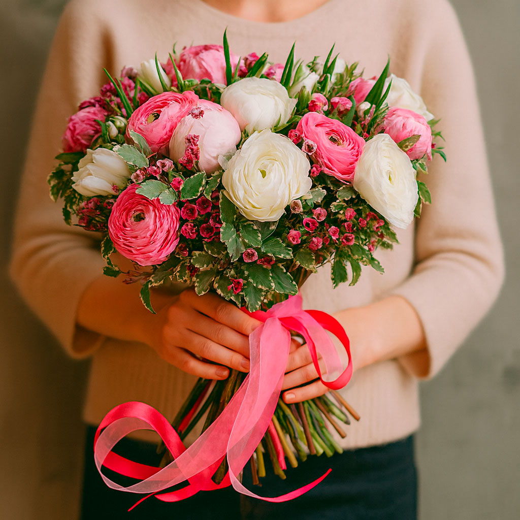 Погрузитесь в мир нежности с этим изысканным букетом, в котором белые и розовые ранункулюсы гармонично сочетаются с розовыми пионами и ваксфлауэром. Букет перевязан яркой атласной лентой, что придаёт ему особую элегантность. Возможна упаковка в матовую плёнку или крафт-бумагу. Прекрасный выбор для подарка на годовщину для любимой.