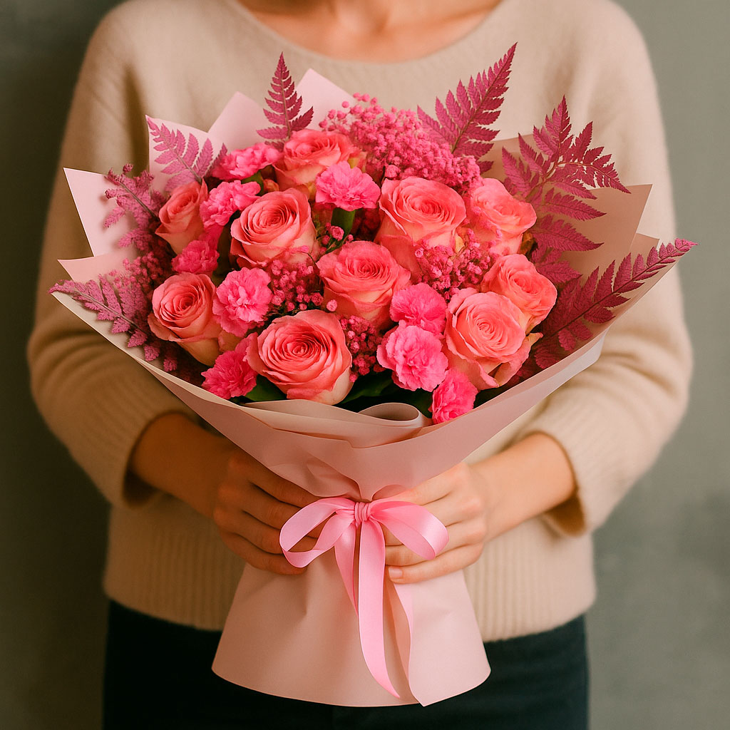 Розовые одноголовые розы и мини-гвоздики создают нежную композицию, дополненную изящным папоротником и сухоцветами. Букет оформлен в матовой плёнке с розовой лентой, что подчёркивает его утончённость. Возможны альтернативы с атласной лентой или крафт-бумагой. Прекрасный выбор для поздравления любимой на день рождения.