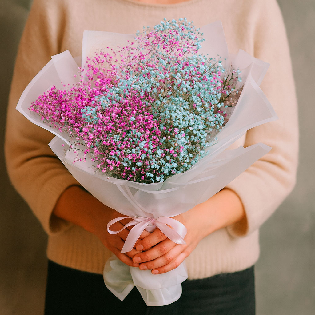 Фиолетовая и зеленая гипсофила создают нежное облако, которое завораживает своей легкостью и изяществом. Букет оформлен в матовую пленку и перевязан атласной лентой. Возможны варианты упаковки: крафт-бумага или декоративная сетка. Прекрасный подарок для любимой на день рождения.