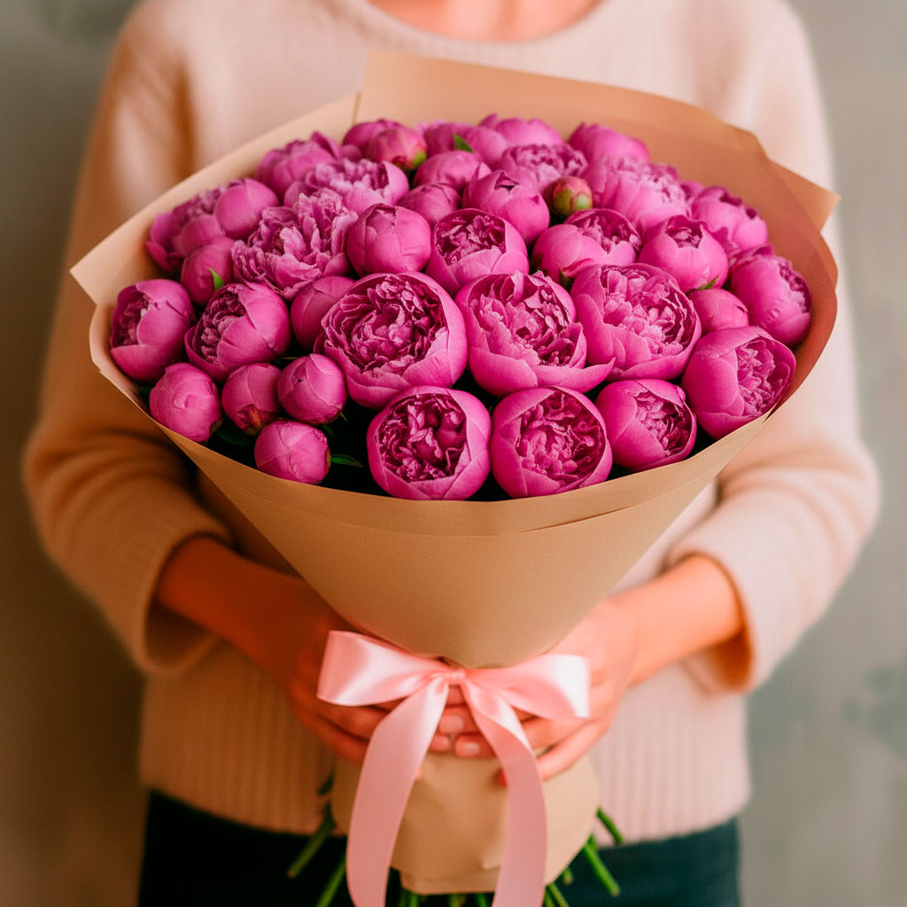 Роскошные розовые пионы создают атмосферу нежности и утончённости. Букет перевязан розовой атласной лентой и упакован в крафт-бумагу, что подчёркивает его естественную красоту. Альтернативно можно оформить в матовую плёнку или декоративную сетку. Прекрасный выбор для подарка на день рождения для любимой.