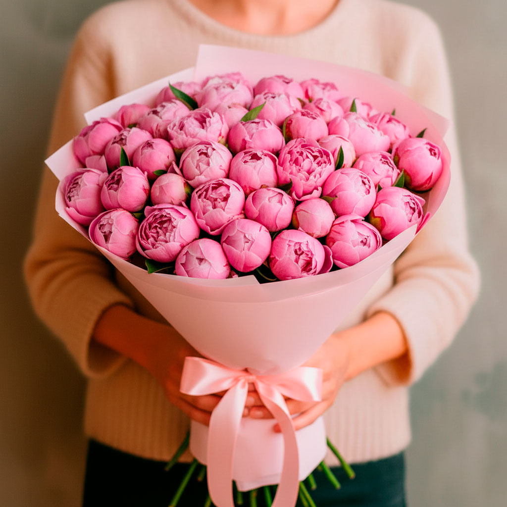 Роскошные розовые пионы создают нежное облако, подчёркивая изысканность и утонченность композиции. Букет перевязан атласной лентой и дополнен матовой плёнкой, что придаёт ему особую элегантность. Возможны альтернативы упаковки: крафт-бумага или декоративная сетка. Прекрасный подарок для любимой на день рождения или годовщину.
