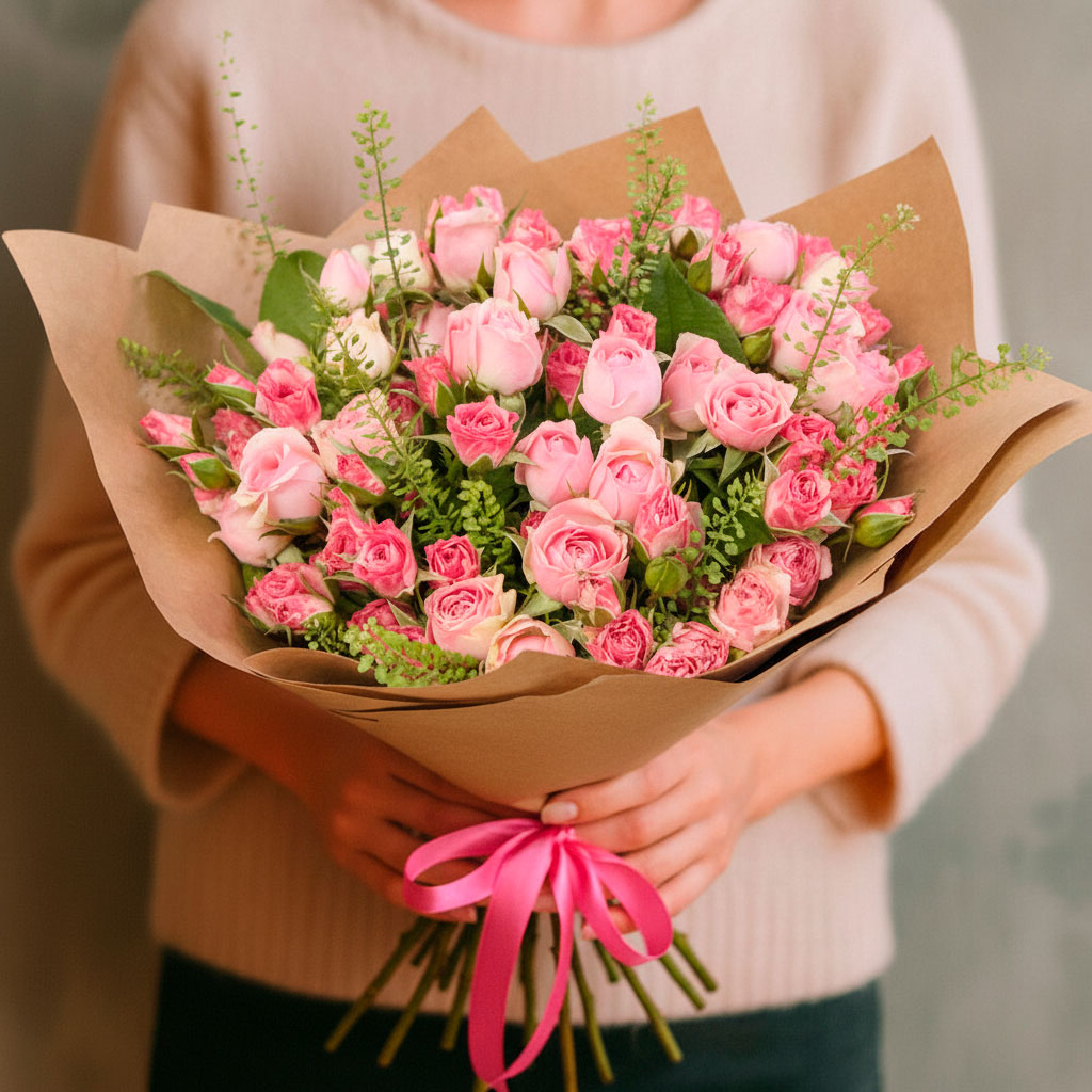Розовые кустовые розы и тласпи создают нежное сочетание, которое очаровывает своей утонченностью. Букет оформлен в крафт-бумагу и перевязан атласной лентой яркого розового цвета. Возможны альтернативы упаковки: матовая плёнка или декоративная сетка. Прекрасный выбор для любимой на день рождения или 8 марта.