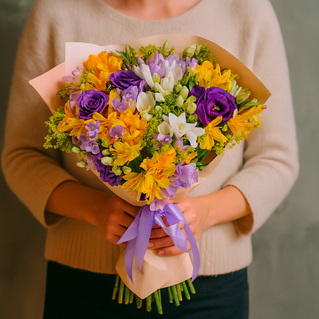 Белоснежные фрезии, солнечные альстромерии и фиолетовые эустомы создают яркий и гармоничный ансамбль. Букет оформлен в матовую плёнку и перевязан атласной лентой нежного фиолетового оттенка. Возможна упаковка в крафт-бумагу или декоративную сетку. Прекрасный выбор для подарка на день рождения для любимой.