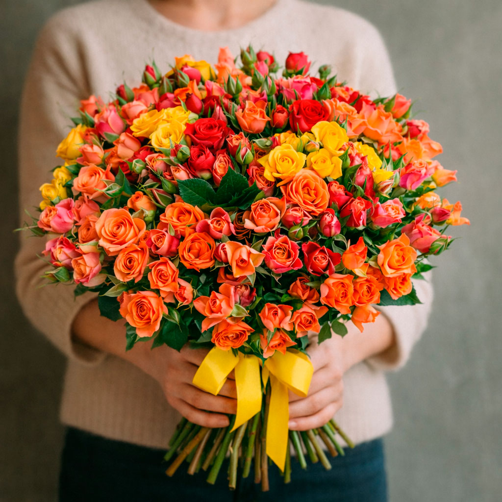 Яркий букет из кустовых роз в желтых, оранжевых и розовых тонах создаёт атмосферу праздника. Перевязан жёлтой атласной лентой, он выглядит особенно нарядно. Возможны варианты упаковки в матовую плёнку или крафт-бумагу. Прекрасный выбор для подарка на день рождения для любимой или подруги.