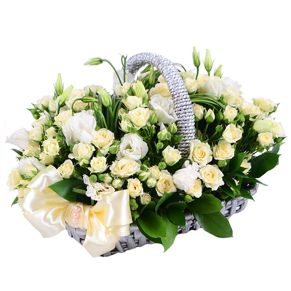 Изящная композиция из кремовых кустовых роз и белых эустом, дополненная свежей зеленью, создает атмосферу утончённой красоты. Цветы аккуратно расположены в плетёной корзине, украшенной атласной лентой. Возможны альтернативы оформления: корзина из ротанга или с тканевой отделкой. Прекрасный подарок для любимой на годовщину или день рождения.