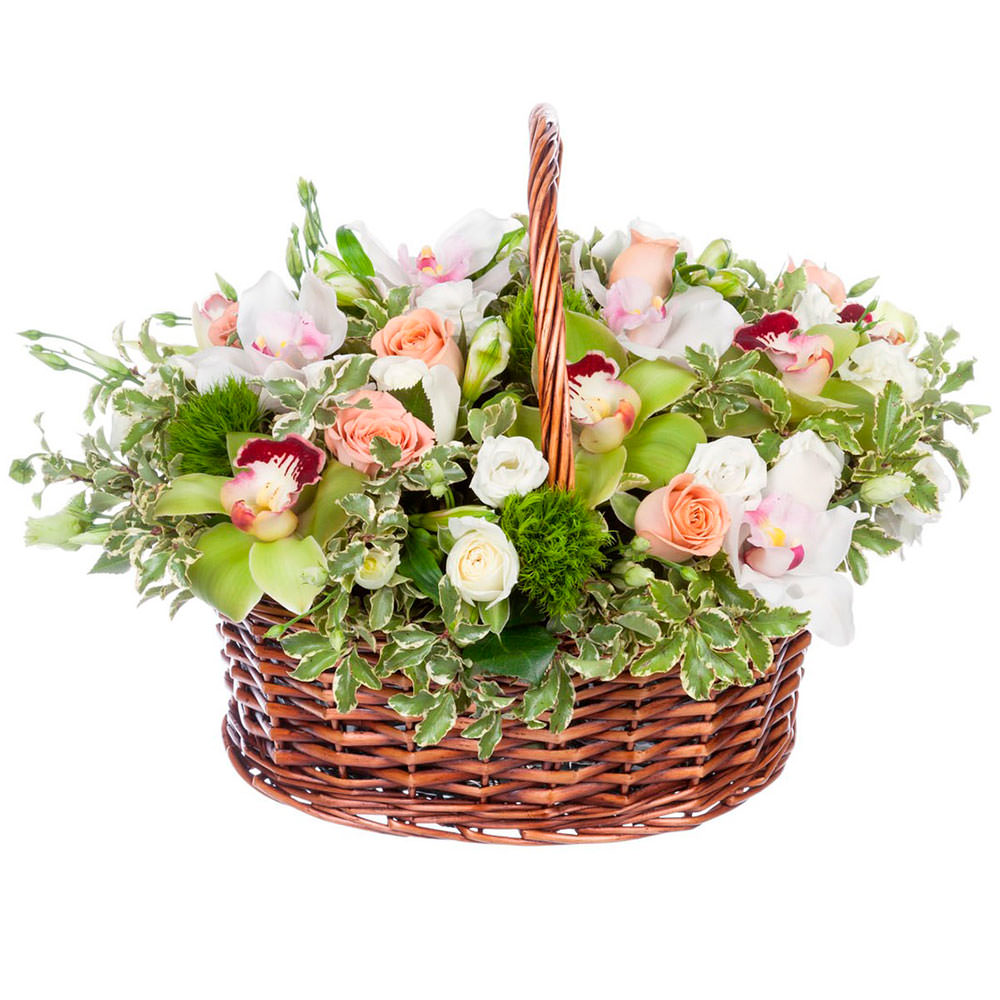 Великолепная цветочная композиция из белых и персиковых роз, белых и зеленых орхидей, дополненная питтоспорумом и гвоздикой, создает атмосферу нежности и утонченности. Корзина из лозы придает естественность и гармонию. Возможны варианты оформления в плетёной корзине или корзине из ротанга. Прекрасный подарок для мамы на юбилей или для коллеги на новоселье.