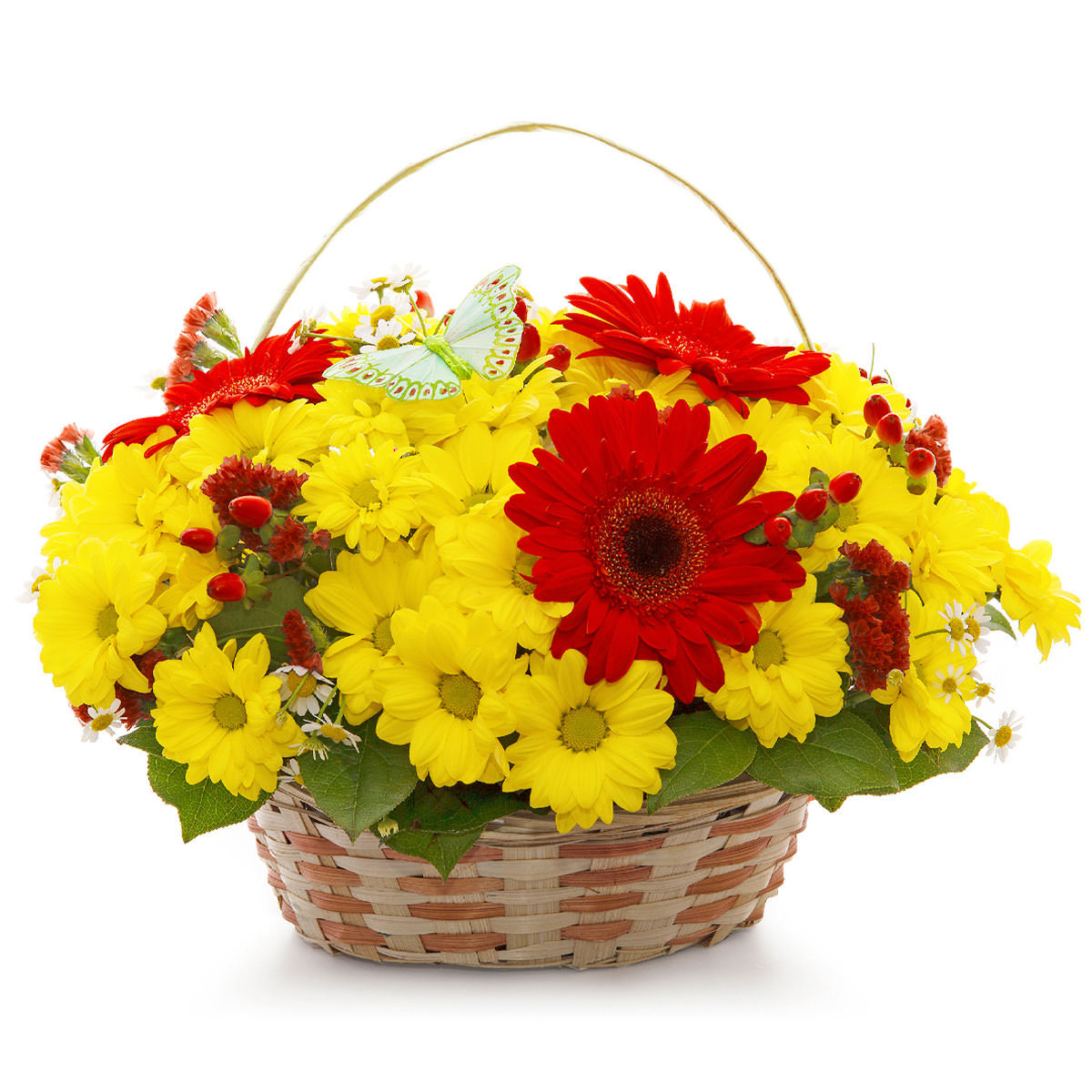 Яркая корзина с красными герберами, желтыми кустовыми хризантемами и нежными ромашками, дополненная гиперикумом и статицей, создает атмосферу радости и тепла. Плетёная корзина добавляет естественности и уюта. Возможны альтернативы оформления: корзина из лозы или корзина с тканевой отделкой. Прекрасный подарок для любимой на день рождения или годовщину.