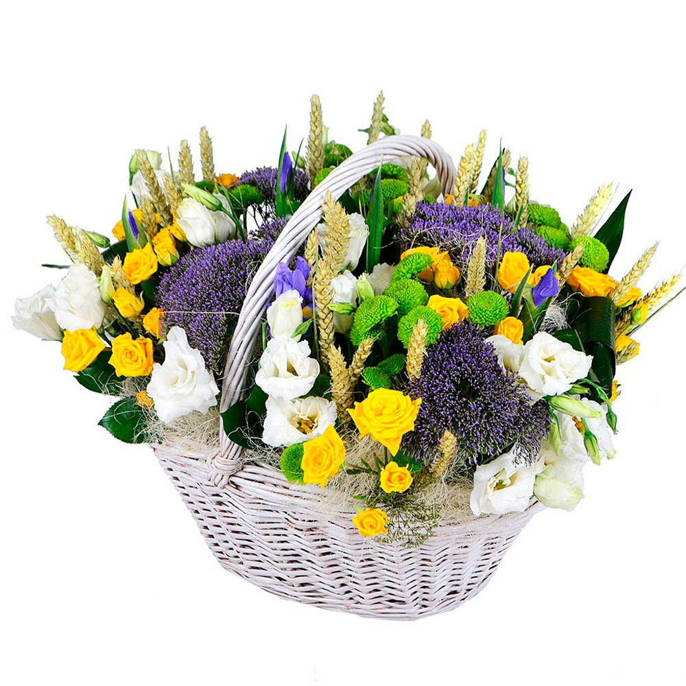 Яркая цветочная композиция включает в себя трахелиум, зеленую кустовую хризантему, желтую кустовую розу, белую эустому, колосья и аспидистру. Все цветы аккуратно размещены в плетёной корзине с оазисом, создавая атмосферу летнего настроения. Возможны альтернативы оформления: корзина из лозы или ротанга. Прекрасный выбор для поздравления на день рождения или для любимой.