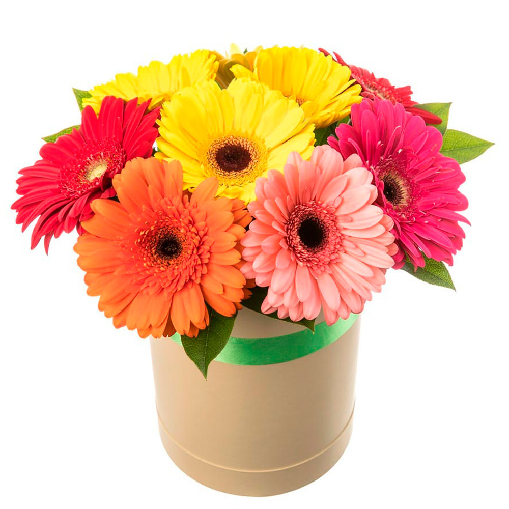 Яркие герберы в жёлтых, розовых и оранжевых тонах создают атмосферу радости и тепла. Композиция дополнена свежей зеленью, подчёркивающей насыщенность цветов. Цветы оформлены в элегантной шляпной коробке, которая придаёт букету стильный вид. Возможны варианты упаковки в бархатную или атласную коробку. Прекрасный подарок для любимой на день рождения или 8 марта.