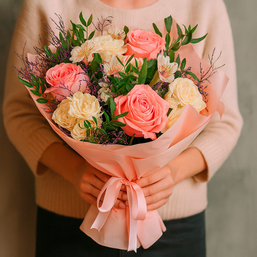 Розовые одноголовые розы и белые кустовые розы создают нежный контраст с белыми альстромериями и лимониумом, окружённые свежей зеленью. Букет оформлен в матовую плёнку пастельного оттенка и перевязан атласной лентой. Возможны альтернативы оформления: крафт-бумага или декоративная сетка. Прекрасный выбор для подарка на день рождения или для любимой.