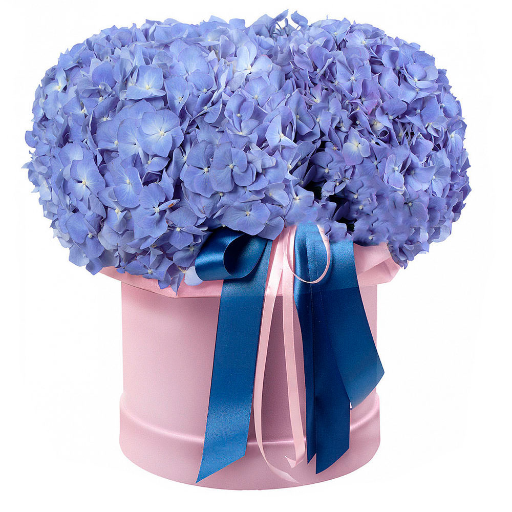 Гортензия в нежной розовой шляпной коробке создает атмосферу утонченной элегантности. Яркая синяя лента добавляет изысканности и завершает образ. Возможны альтернативы оформления: бархатная коробка или коробка с принтом. Прекрасный подарок для любимой на годовщину или день рождения.
