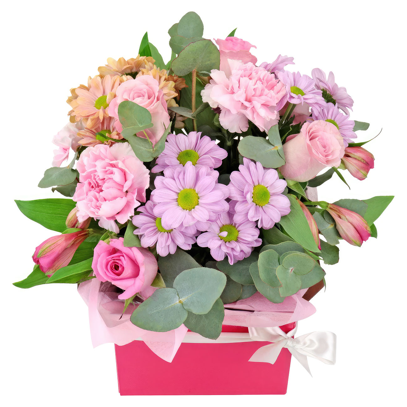 Розовые розы, сиреневые и кремовые хризантемы, розовые альстромерии и гвоздики, дополненные эвкалиптом, создают нежную и романтичную композицию. Цветы оформлены в яркую квадратную коробку, перевязанную атласной лентой. Возможны варианты с бархатной или дизайнерской коробкой. Прекрасный подарок для любимой на 8 марта или на день рождения.